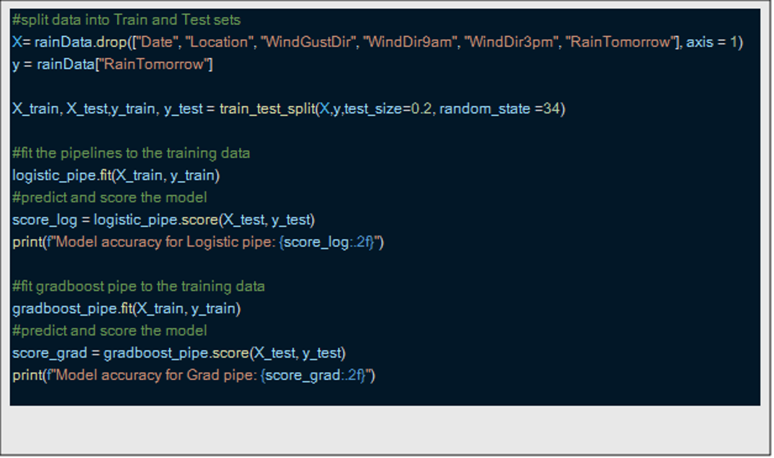 I have chosen to show one pipeline of a principal components analysis (PCA) model combined with a logistic regression model, and a second pipeline with gradient boosting. The only difference I had to change was the last step's name, and both pipelines work the same.