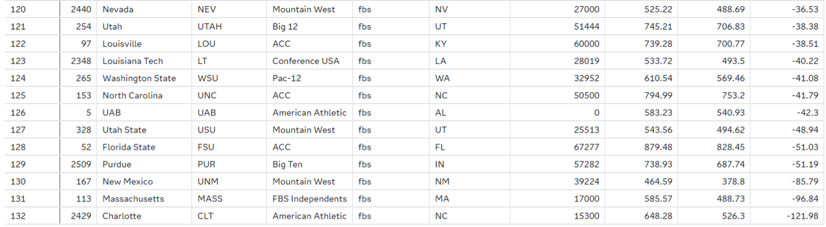 You would expect the big Power 4 names to top the DELTASORT table, but, as we'll see in the TALENTSORT table, it's hard to post such large gains when your team was already so talented AND losing players to graduation and transfers. Sympathies do go out to Charlotte, who rounds out the bottom after being virtually gutted over the offseason. Perhaps that partially explains their 1-9 record on the year: