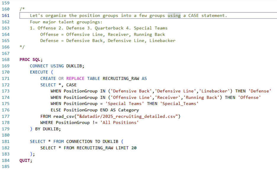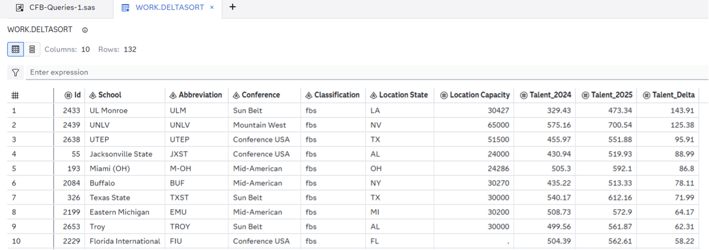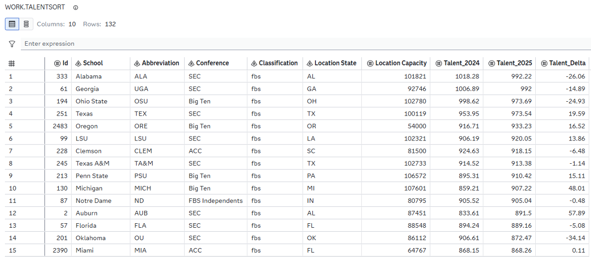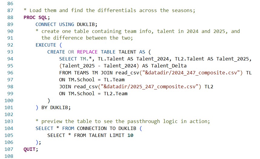 The first PROC SQL mimics what we did for the TEAMS dataset, and tells us we have three columns: “Year”, “Team”, and “Talent.” Knowing that we have two files, one for 2024 and one for 2025, I join BOTH tables to the DUKLIB.TEAMS table on account of team name, then create a calculated column, “Talent_Delta”, of the difference between the 247-assessed talent metrics. Lastly, I use a SELECT * FROM CONNECTION statement to preview my new dataset, DUKLIB.TALENT.