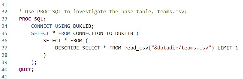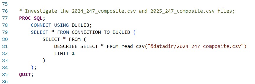 Using PROC SQL, I push-down a DESCRIBE SELECT * statement into the DuckDB instance, instructing it to tell me about the CSV dataset columns by just reading one line. In that sense, it's a SQL-writer's parallel to PROC CONTENTS.