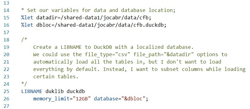 One neat capability of DuckDB is its versatility in connecting to data sources; if I were dealing with much larger scale datasets, I might have stored them on an S3 bucket, which SAS/ACCESS to DuckDB can query from with ease using DuckDB's installable extensions. That won't be the case here given the small-scale data at hand. As with any SAS pipeline, the first code we'll execute will set up a Library connection using the DuckDB Engine:
