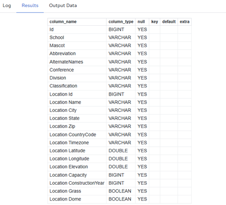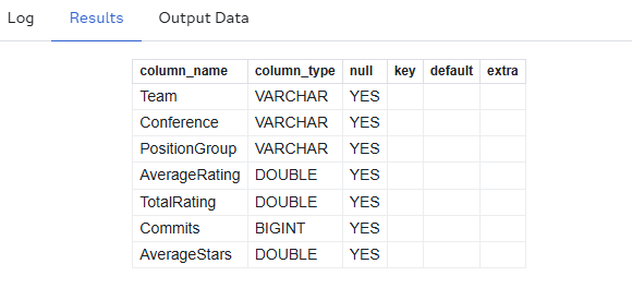Anyways, let's investigate the recruiting using the 2025_recruiting_detailed.csv dataset. Just as in the previous investigation, I'll use the DUKLIB connection to select the results of a DESCRIBE statement to get the metadata on our columns.