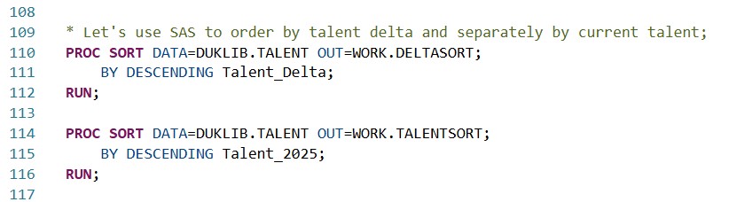 So far, everything I've done has been in PROC SQL, which makes sense, since DuckDB, after all, is operated with SQL. But can I leverage other PROC's from SAS' toolbox as I would with a different library connection? The answer is a resounding YES. Let's create two tables in our ephemeral WORK library by using PROC SORT on our DUKLIB.TALENT table, ordering our FBS teams by “Talent_Delta” in one output, and by “Talent_2025” in another.