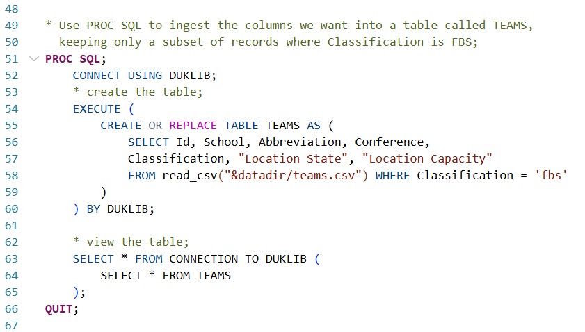 I'm doing a few different things in one procedure here. First, I use the CONNECT statement (as done previously) to tell SAS which data source to connect to (the DuckDB library, of course). The EXECUTE statement explicitly pushes SQL code down to DuckDB, meaning that I can write anything I want in DuckDB's flavor of SQL (closely related to the PostgreSQL dialect). This dialect allows us to leverage tons of features unavailable to the standard PROC SQL syntax. An easy but significant example here is the CREATE OR REPLACE syntax, which, if ran implicitly in PROC SQL on a standard SAS library, would not be recognized! This is obviously nice since I continually, without fail, forget to drop tables when I edit and re-run queries.