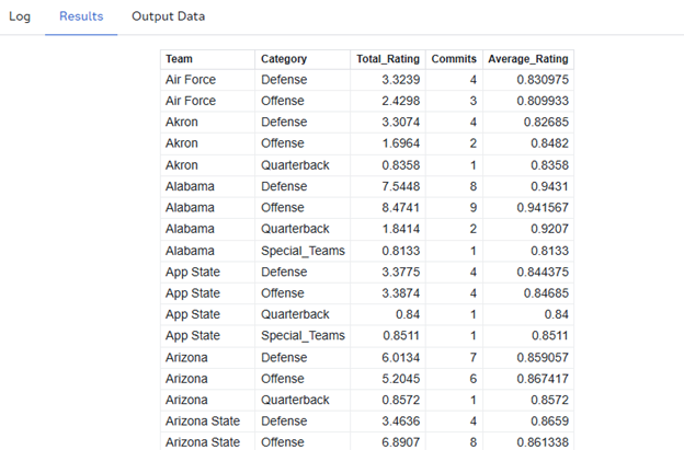 Our newest table, DUKLIB.RECRUITING_PIVOT, now contains just a single record per team, with clearly named columns defining the number of commits, total rating, and (more importantly) average rating in each major category of the game.