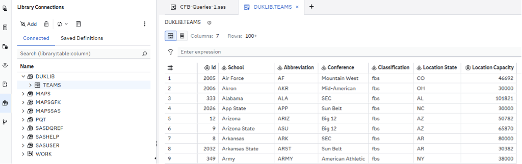 We now have a TEAMS table under DUKLIB, which we can see in our Library pane, just as we would with any other type of data source: