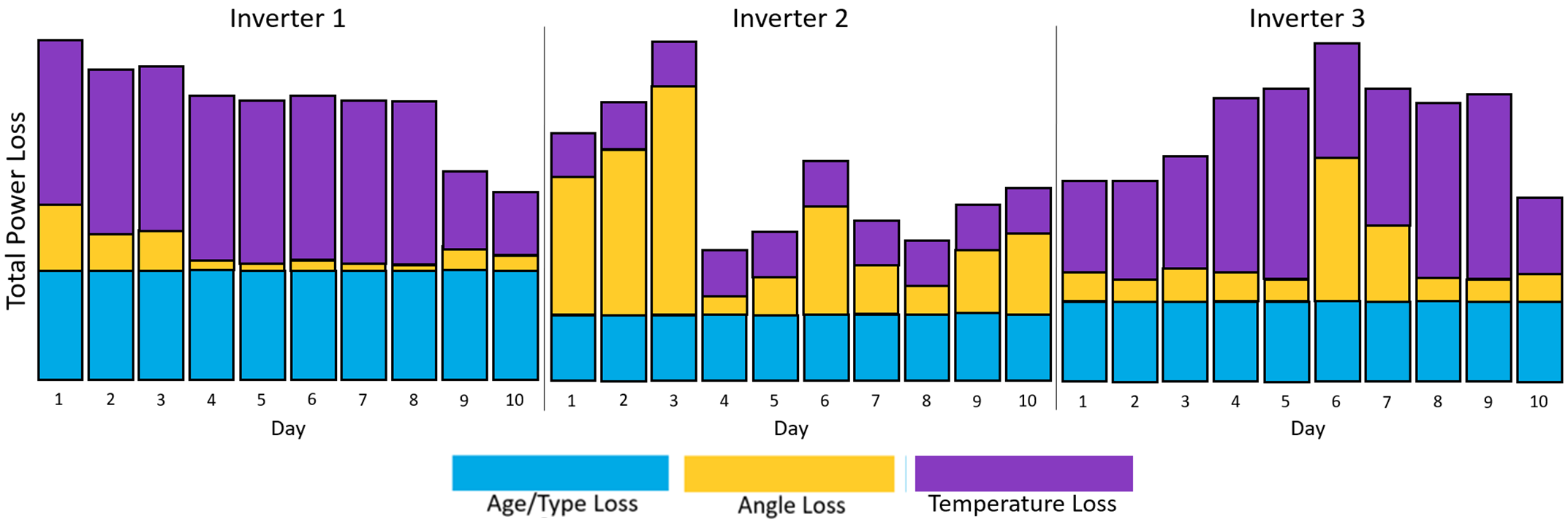 On the other hand, Figure 4 illustrates the power loss by category for each inverter over a 10-day period. For Inverter 1, the percentage of power loss due to panel angle deviation is small, indicating the tracker system is working as expected. For Inverter 2, however, the tracker system appears to be experiencing issues during the first three days. Temperature-related power loss plays a major role for inverters 1 and 3, indicating the overheating of the panels, and the need to monitor the cooling systems.