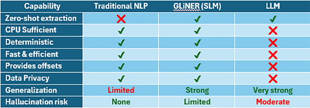 Given these trade-offs, many organizations are left wondering whether there is a practical middle path between rule-based systems and full-scale LLMs. This is where SLMs, and GLiNER specifically, enter the picture. Table 1 compares the strengths and weaknesses of different NER approaches.