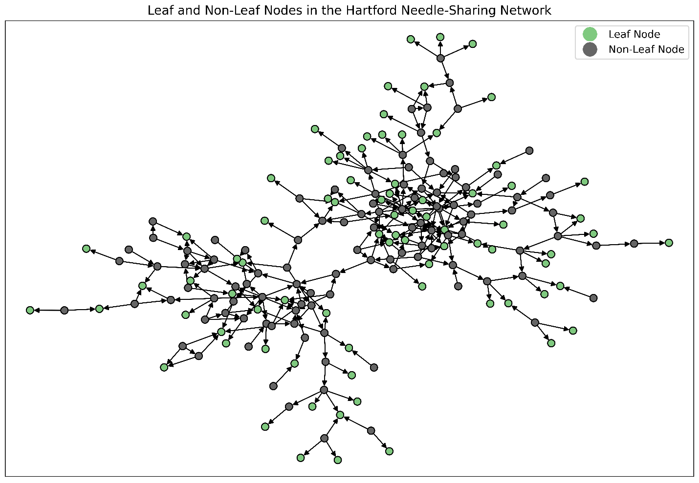 The resulting network with highlighted leaf nodes is shown in Figure 2. In the context of needle sharing, these leaf nodes represent individuals who receive needles but do not pass them on to others. This makes them endpoints in observed sharing chains. Such nodes might correspond to new participants, individuals with limited social connections, or users whose risky behaviors do not propagate further through the network.