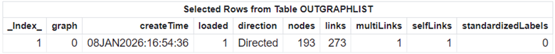 proc cas; loadactionset "network"; action network.loadGraph result=r status=s / links = "DrugNetwork" direction = "directed" outGraphList = "OutGraphList"; run; action table.fetch / table = "OutGraphList"; run; quit; |