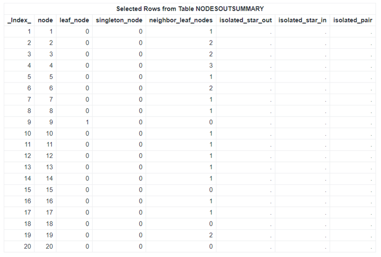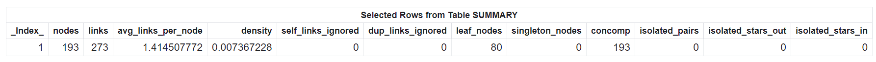 proc cas; action network.summary result=r status=s / graph = 0 outNodes = "NodesOutSummary" out = "Summary" connectedComponents = true; run; action table.fetch / table = "NodesOutSummary"; run; action table.fetch / table = "Summary"; run; quit; |