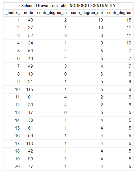 proc cas; action network.centrality result=r status=s / graph = 0 degree = "unweight" outNodes = "NodesOutCentrality"; run; action table.fetch table = "NodesOutCentrality" sortBy = {{name = "centr_degree" order="descending"} {name = "centr_degree_out" order="descending"}}; run; quit; |