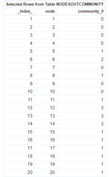 proc cas; action network.community result=r status=s / graph = 0 resolutionList = 0.3 outNodes = "NodesOutCommunity"; run; action table.fetch / table = "NodesOutCommunity"; run; quit; |
