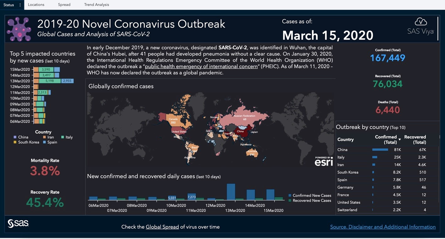 この記事はSAS Institute Japanが翻訳および編集したもので、もともとはMark Lambrechtによって執筆されました。元記事はこちらです(英語)。 世界的な公衆衛生問題が拡散する際、初期段階では多くの不明事項が存在するものですが、新型コロナウイルスのように急速な感染拡大の場合は特にその度合が高まります。データ・ビジュアライゼーションは、傾向を理解したり、複数のデータポイントから意味のあるストーリーを組み立てたりするための優れたスタート地点となりえます。ウイルスの拡散状況を視覚化できる機能は、問題意識の喚起、そのインパクトの理解、そして究極的には予防努力の支援に役立つ可能性があります。 2019年12月31日、世界保健機関(WHO)の中国オフィスは、中国湖北省の武漢市で検知された原因不明の肺炎の感染ケースについて報告を受けました。最初の報告以降、この新型コロナウイルス(SARS-CoV-2)は世界的な感染拡大を見せており、感染者は30ヶ国以上の数万人に及び、「新型コロナウイルス感染症(COVID-19)」と呼ばれる急性呼吸器疾病を引き起こしています。 この状況を受け、SASは新型コロナウイルスの現況、場所、拡散状況、トレンド分析を描き出すインタラクティブなレポートを作成しました。 元になるデータは日次で更新されており、感染拡大の進行状況を定期的にチェックすることや、世界的な拡散状況を時間軸に沿ったアニメーションで確認することができます。この対話操作型レポートでは以下のことが行えます。 過去10日以内に新たに確認された感染者の数を調べ、このウイルスの感染率、回復率、死亡率がどのように推移しているかを確認する。 このウイルスがどの地域に侵入したかを調べ、発生地の中国と世界の残りの地域とで状況を比較する。 感染確認済みのケースを分析することで、回復率が時の経過に沿ってどのように変化しているかを理解する。 このレポートはSAS Visual Analyticsと、WHO、CDC、ECDC、NHC、およびDXYからのデータ(JHU CSSEによってコンパイルされたもの)を用いて作成されています[訳注:JHU CSSE=米国ジョンズ・ホプキンズ大学システム科学工学センター]。 SAS Visual Analyticsで作成した新型コロナウイルス・レポートの概要 「新型コロナウイルス感染症(以下、COVID-19)」の感染拡大に関するサマリー情報を手早く確認したい場合は、こちらをご覧ください。 このサマリー情報は、世界各地の統計情報を用いて日次で更新されています。このWebページのこれ以降では、各種レポートからの重要な洞察をスクリーンショットでご紹介します。実際のレポートでは、最新のデータに基づき、ご自身で対話操作しながら統計情報や分析結果を閲覧することができます。 地域別の詳細情報を確認したい場合や、対話操作型レポート全体を探索したい場合は、サマリー情報ページの右上隅にある「Full Report」ボタンをクリックすると、完全なダッシュボードを起動できます。 最初に表示されるダッシュボード・ビュー([Status]タブ)では、日次で更新されるデータに基づき、COVID-19の感染拡大の概況を簡単に確認できます。具体的には、新たに確認された感染者数、回復者数、死亡者数などを地域別にフィルタリングして閲覧することができます。 図1: COVID-19の感染拡大の概況。新たに確認された感染者数、回復者数、死亡者数などを地域別にフィルタリングして閲覧することができます。 レポートの[Locations]タブ(下の図2)では、 全世界および特定国の新型コロナウイルス関連データを確認できます。 図2:[Locations]タブでは、全世界および特定国の新型コロナウイルス関連データを確認できます。 特定国のデータを見るには、左上のフィールドに国名を入力します(下の図3)。 図3: 国名を入力すると、その国の詳細情報だけに集中することができます。 新型コロナウイルスの最初の感染者が中国で報告されてから既に何週間も経過しており、感染拡大は世界各地へと広がっています。私たちは、Esri社のGISマッピング・ソフトウェアから取得した地理空間データのレイヤーを追加することで、対話操作型の画面を用いて、中国とその他の国々にまたがる形で新型コロナウイルスの拡散状況を探索できるようにしました。 [Spread]タブでは、SAS Visual Analyticsの時系列アニメーション機能(下の図4)を用いて、ウイルスが世界全体に拡散していく様子を見ることができます。アニメーションを再生すると、中国国内での拡散状況や、世界全体の拡散状況および深刻度を確認できます。 図4: 時系列アニメーションで、ウイルスが世界全体に拡散していく様子を見ることができます。 [Trend Analysis]タブでは、様々なビジュアライゼーションを切り替えながら、COVID-19の感染拡大に関連したその他のデータの傾向を見ることができます(下の図5)。 図5: 日次の感染者数/死亡者数のトレンド分析 [Epidemiological Analysis]タブでは、罹患率および有病率を見ることができます。 図6: 10万人あたりのCOVID-19感染者数を国ごとに見る 図7: 
